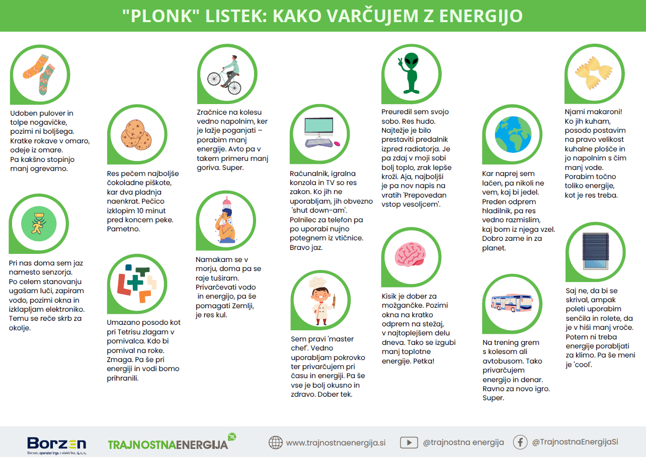 Spodaj se nahaja zbirka nasvetov "Učinkovito ravnajmo z energijo", letak "Učinkovito ravnajmo z energijo v pisarni" in "Plonk listek: Kako varčujem z energijo".