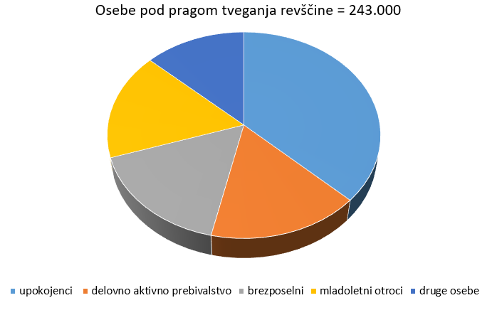 Podatki SURS za leto 2019 kažejo, da je od vseh 243.000 oseb pod pragom tveganja revščine bilo 90.000 upokojencev (18,2 % od vseh upokojencev), 40.000 delovno aktivnih (4,5 % od vseh delovno aktivnih), 40.000 brezposelnih (43,6 % od vseh brezposelnih), 41.000 mladoletnih otrok (10,5 % vseh otrok) in 32.000 drugih oseb (18,9 % od vseh nezmožnih za delo, gospodinjstvo, študentov, drugih neaktivnih in nerazvrščenih oseb).